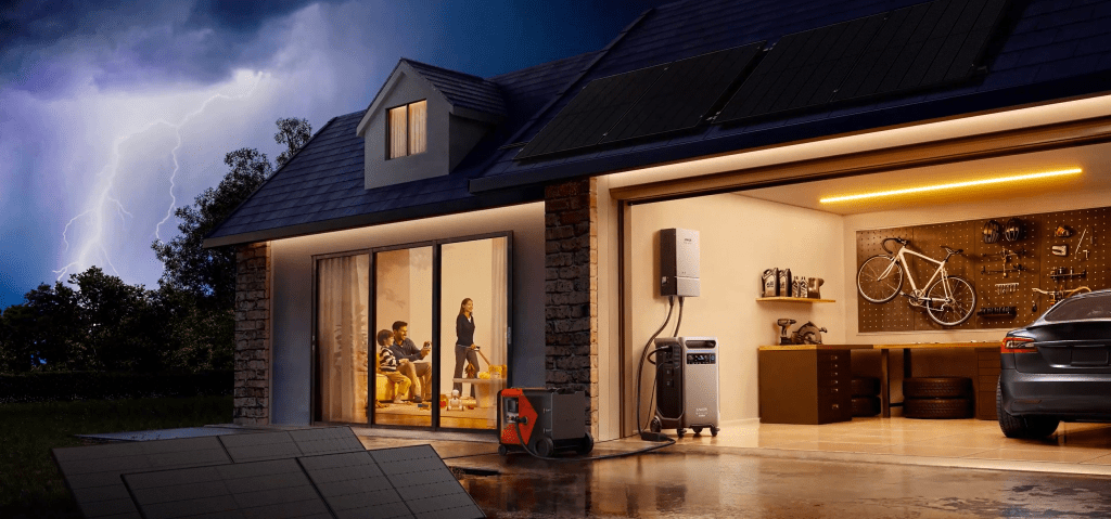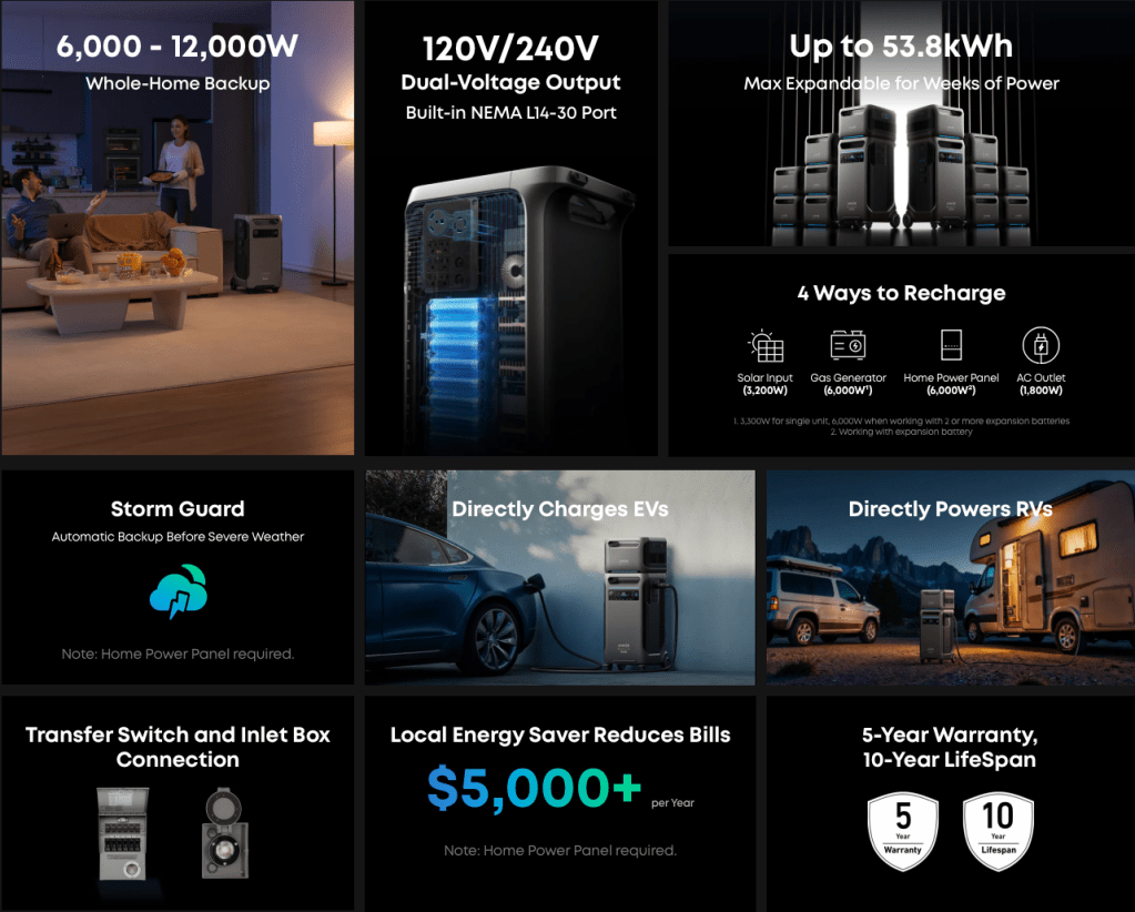 Ofrece una potencia de salida de 6.000 W a 12,000 W con soporte para voltaje dual de 120V y 240V, lo que la hace compatible con una amplia gama de electrodomésticos y herramientas de alto consumo energético. Esta capacidad permite alimentar directamente vehículos eléctricos y recreativos a través de los puertos NEMA 14-50 y L14-30 integrados en la unidad.